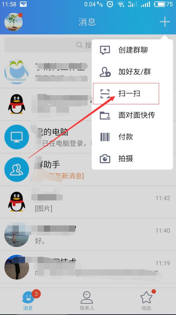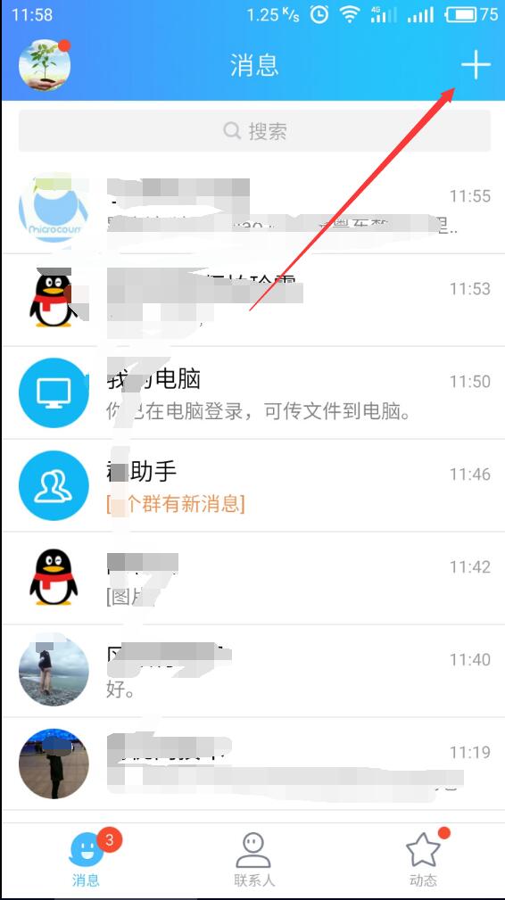 第一步:打开QQ聊天界面,点击右上角的“+”号