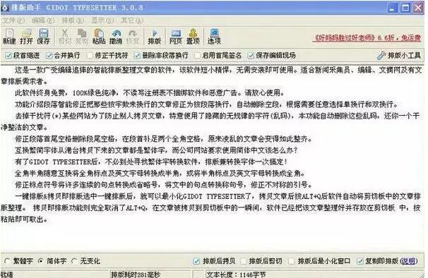 通过软件可以段落智能修正、去掉某些防拷贝的干扰符、修正段落首尾空格、互换繁简字体、全角半角随意互换、修正标点符号、一键排版等。