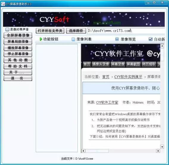 这是一款屏幕录像、网页操作录像、桌面操作录像的免费软件。支持全屏录像和区域录像,录制完成后,单击热键『Esc』,自动保存屏幕录像。屏幕录像时,还可自由选择是否录制声音(默认的设置中没有开启声音录制)。