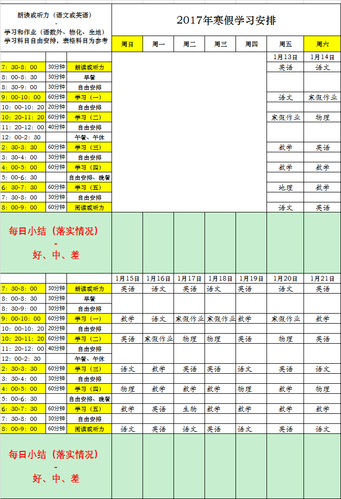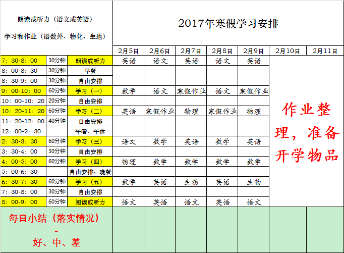 下面给各位提供了一个时间安排表,这样可以提高效率,各位可以参考,并且尽量按照下面提供的表格有序完成,表格的任务安排比较紧,各位可以根据自己实际情况作出适当的调整,做到有计划有节奏的完成假期学习,好好反思一下自己不足的地方,检省一下自己的学习情况。。