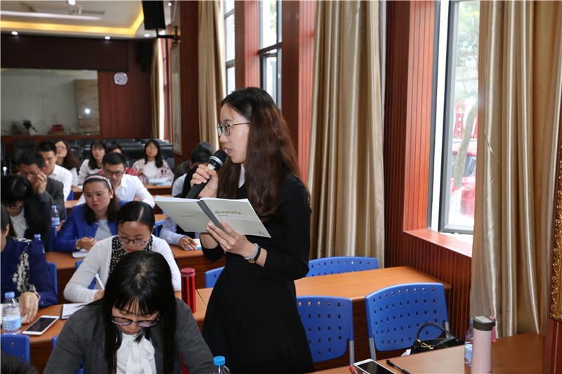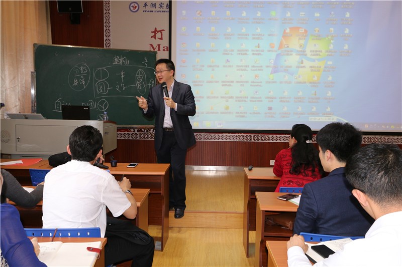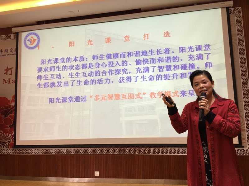接着屈红燕校长结合课堂情景分享了平湖实验学校的阳光文化、办学理念,以及结合学校地域、学生、家长及年轻教师的特点量身打造的“多元智慧互助式”教学模式,并从“共同体分组形式、捆绑式评价方式、课型分类设计方案”等方面重点介绍了各个操作环节,让大家对阳光课堂有了更深入的了解。