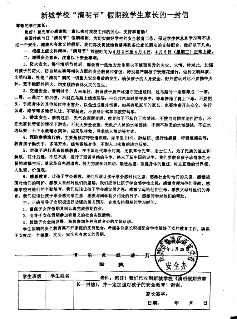 清明放假事宜刘浩东家长已知悉
