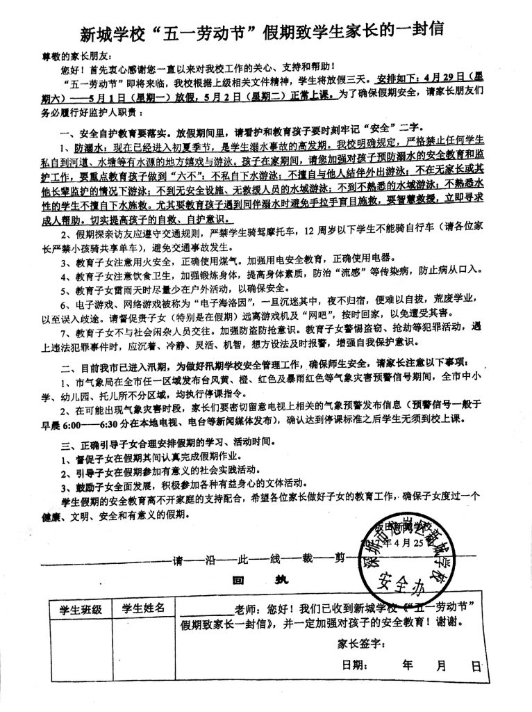 1、“XXX学生家长已知晓五一假期相关事项。”