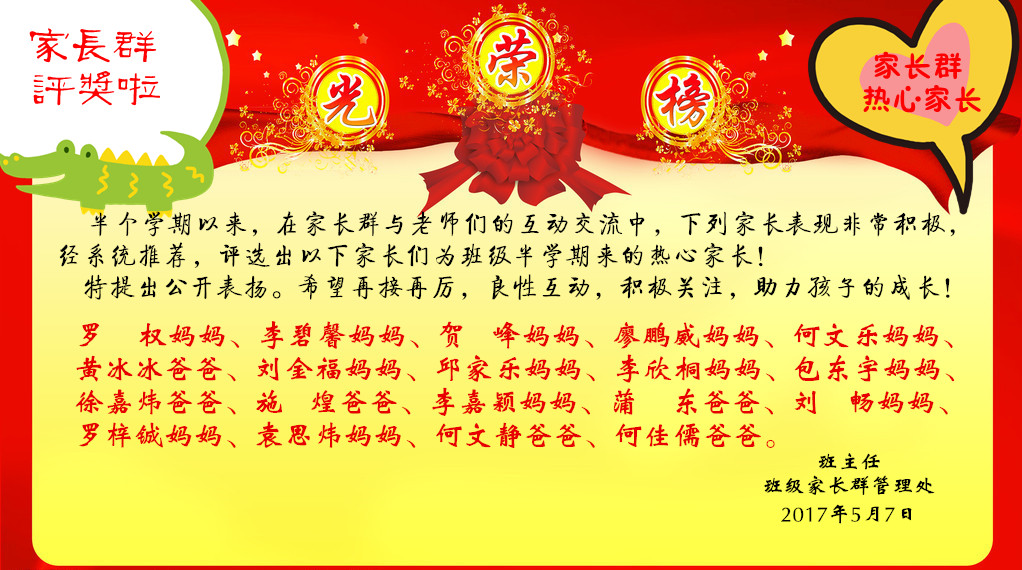 半个学期以来,在家长群与老师们的互动交流中,下列家长表现非常积极,经系统推荐,评选出以下家长们为班级半学期来的热心家长!