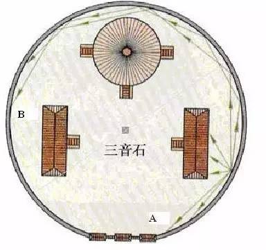 同样,在天坛的回音壁接近中心的地面上,有一块石板,人站在它上面拍巴掌,可以听到清晰地三次回声,所以人们把那块石板称为“三音石”。这里能够听到三次回声,是因为祈年殿、侧殿和回音壁分别在不同距离产生的回声。因为声速是一定的,最先反射的是祈年殿,因为它离三音石最近,再后是侧殿,最后才是回音壁的反射的声音,所以能够清晰地听到三声。