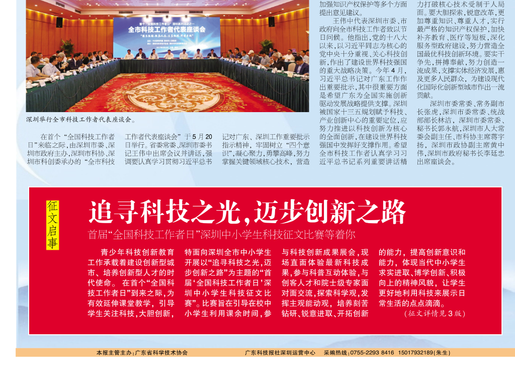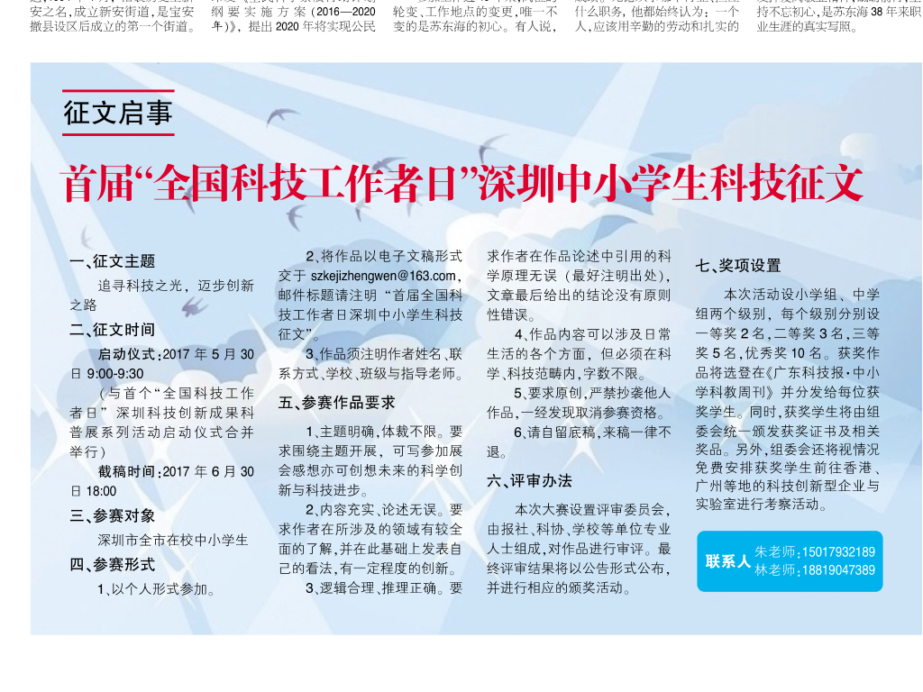 为有效延伸课堂教学,引导学生关注科技,大胆创新,特面向深圳全市中小学生开展以“追寻科技之光,迈步创新之路”为主题的“全国科技工作者日”征文比赛活动。