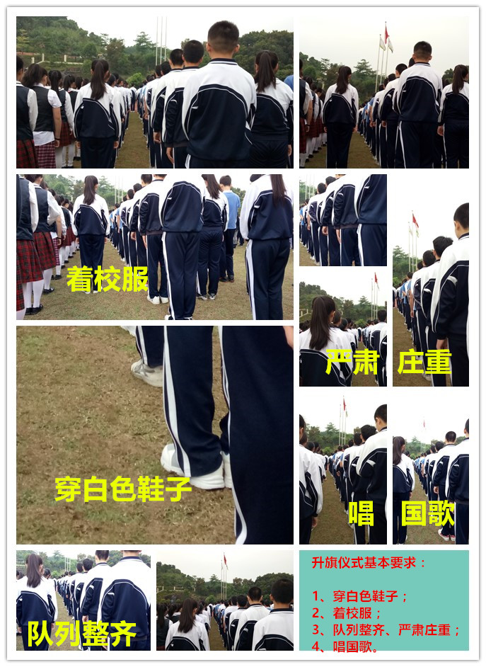 周一升旗仪容仪表有反弹和松懈迹象,三个人的鞋子不合格。再次重申周一升旗要求如下: