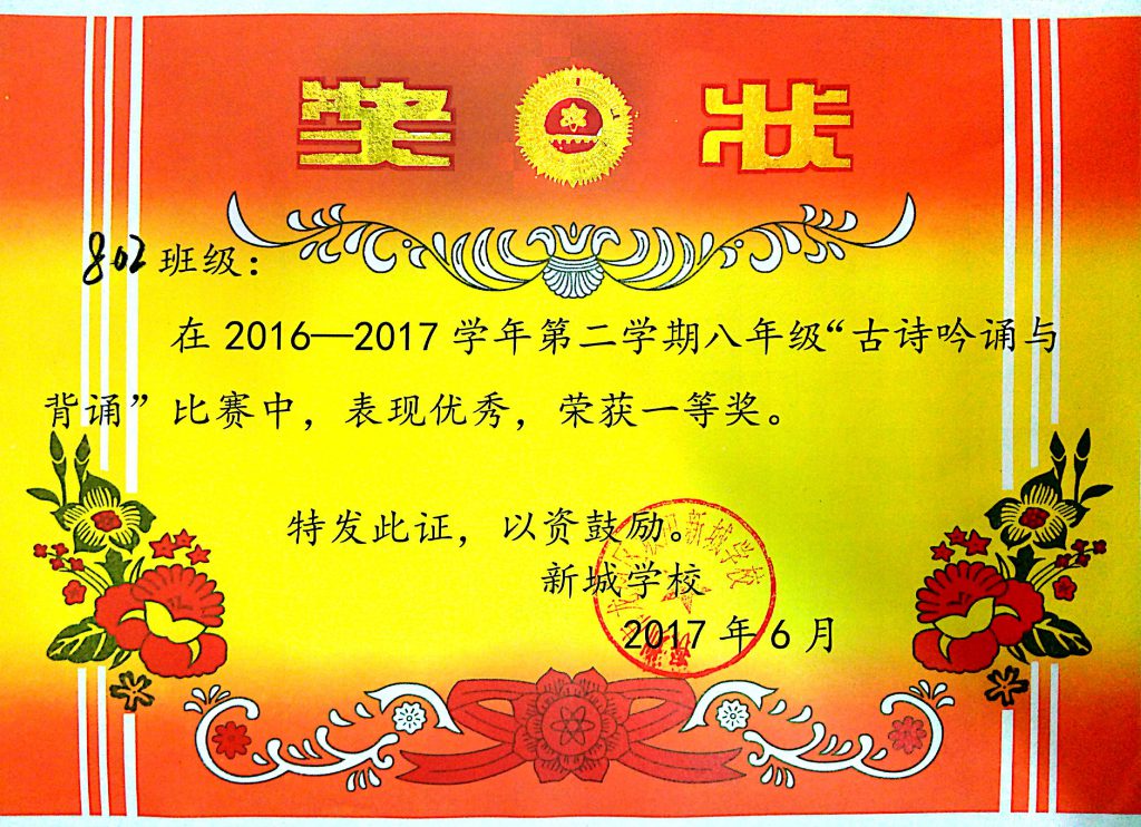 而在古诗词大赛中,我们的表现很棒,拿了第一名。