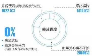在“父母对自己学习的参与程度”一项中,40位参与调查的“学霸”,没有任何一位的学习是被过分参与的,只有9位是被较少干涉,其余均不被干涉,甚至很少被过问。