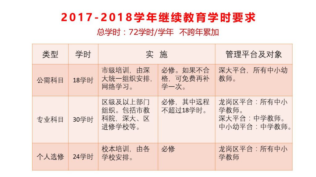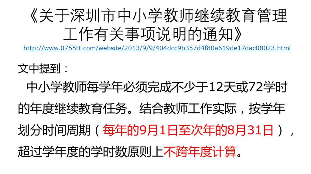 中小学教师每学年必须完成不少于12天或72学时的年度继续教育任务。结合教师工作实际,按学年划分时间周期(每年的9月1日至次年的8月31日),超过学年度的学时数原则上不跨年度计算。