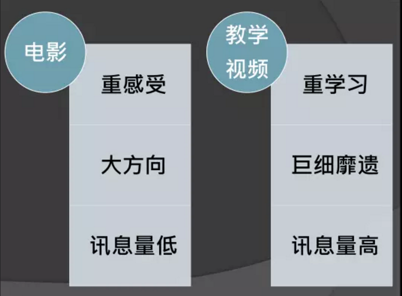 但是教学视频不一样,教学视频它是重学习:你要巨细靡遗地知道每一个细节,信息的浓度是很高的,他的节奏很快,在短时间内要把很多东西都交给你。所以学生有些时候看完视频还是不会,是因为我们的短期记忆容量有限,而且学生把教学视频当做看电影。