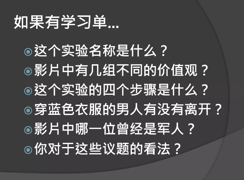 讲述法的内容,看一遍效果是很差的。不过试想,如果现在有学习单,我问你以下问题,你会怎么想?
