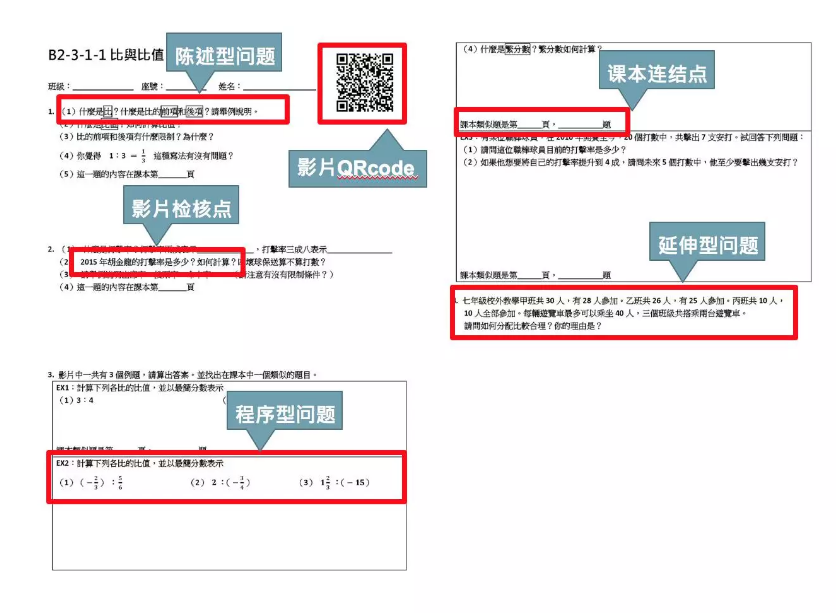 如果只能做一套学习单的话,我们平均会有7成的陈述型题目、 2成程序型题目,延伸型的很少。 如果时间、精力来得及的话,也可以把学习单分成很多级,适合不同学生,比如厉害的学生的习题几乎都是延伸型,普通学生对应设计普通的学习单,针对程度比较差的学生设计的学习单基本上看影片就能找到答案。