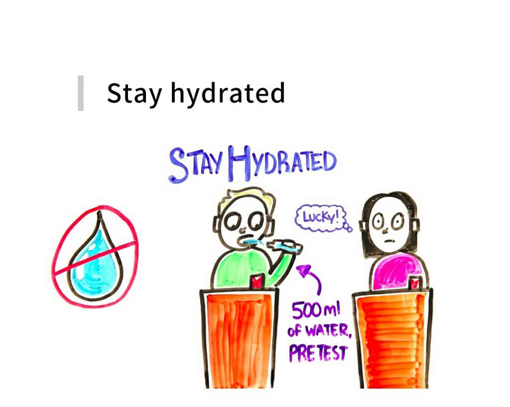 In a study where participants fasted and abstained from fluids since the previous evening, they were asked to perform on a reaction test. One group was given 500ml of water right before the test while the other group wasn’t. The group that was able to hydrate before the test obviously performed significantly better. This is because water helps improve overall mental processing and learning.