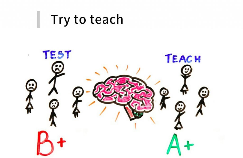 在一个研究项目里,人们被要求学习一篇文章,然后其中一半人被告知他们会在学习后考试,另一半人被告知他们学会后要教给其他的人。那一半被要求教别人的参与者对文章理解得更透彻。因为当你知道要教别人时,你的大脑在组织信息时会更连贯和有逻辑。