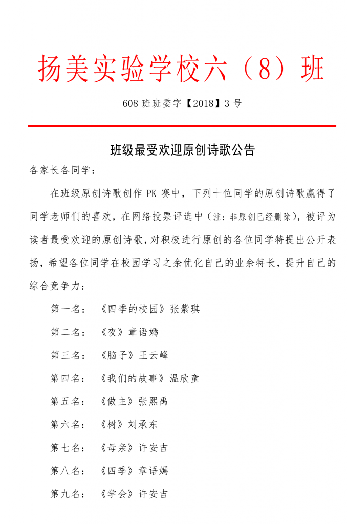 在班级原创诗歌创作PK赛中,下列十位同学的原创诗歌赢得了同学老师们的喜欢,在网络投票评选中(注:非原创已经删除),被评为读者最受欢迎的原创诗歌,对积极进行原创的各位同学特提出公开表扬,希望各位同学在校园学习之余优化自己的业余特长,提升自己的综合竞争力: