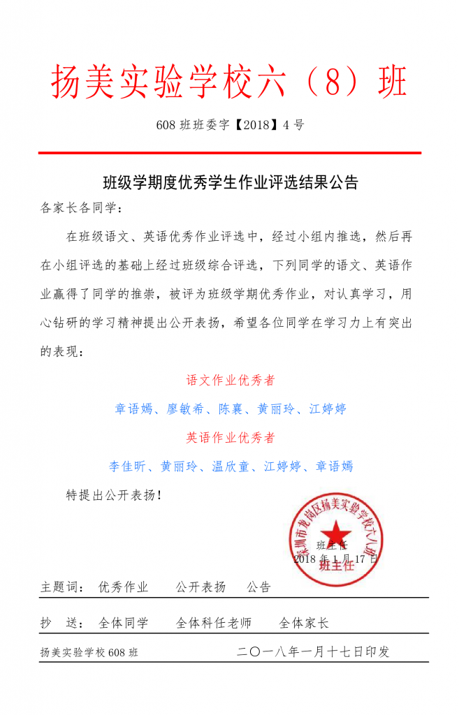 在班级语文、英语优秀作业评选中,经过小组内推选,然后再在小组评选的基础上经过班级综合评选,下列同学的语文、英语作业赢得了同学的推崇,被评为班级学期优秀作业,对认真学习,用心钻研的学习精神提出公开表扬,希望各位同学在学习力上有突出的表现: