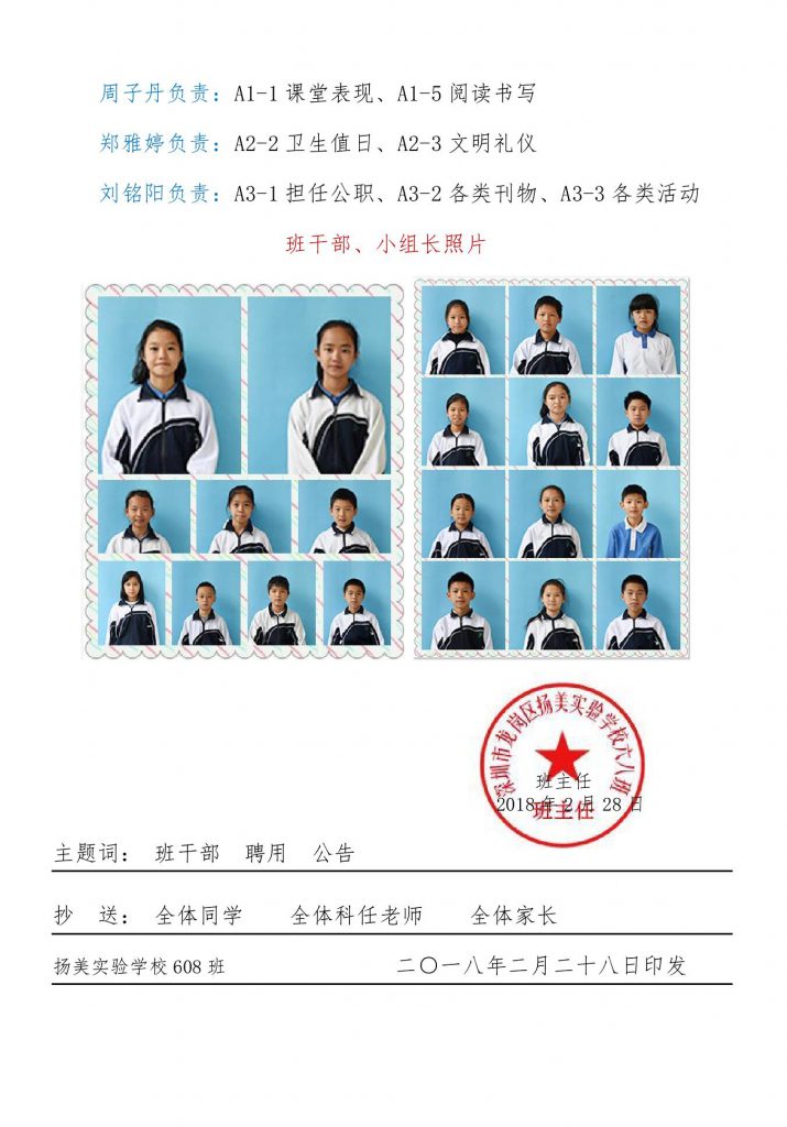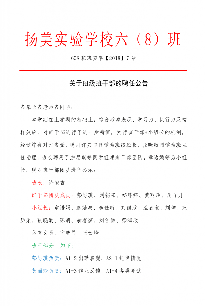 本学期在上学期的基础上,综合考虑表现、学习力、执行力及榜样效应,对班干部进行了进一步精简,实行班干部+小组长的机制,经过综合对比考量,聘用许安吉同学为班级班长,张晓敏同学为班主任助理,班长聘用了彭思琪等同学组建班干部团队,章语嫣等为小组长,现对班干部团队进行公示:
