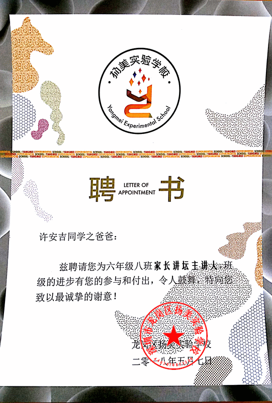 分享会由宋历柔同学主持,年级长李小群老师亲临分享会并向讲坛主讲嘉宾许安吉爸爸颁发了班级故事讲坛主讲人聘书。