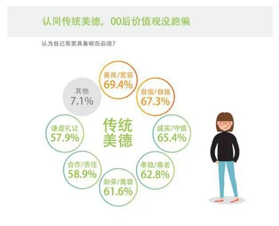 但是《00后画像报告》调查显示,他们对传统美德和主流价值观高度认同,认为自己需要具备善良宽容、自信自强、诚实守信等多样、全面的品德。