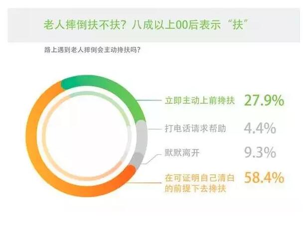 比如,在对“路上遇到老人摔倒会主动搀扶吗?”的提问中,85%以上00后受访者表示要去 “扶”。“扶老人被讹”的新闻的确存在,但00后并未因此变得“明哲保身”。