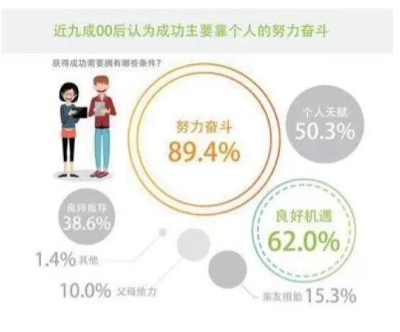第一批00后成年了,他们认为成功靠什么?《00后画像报告》的调查中,近九成的00后首选“奋斗”,大幅高于“机遇” “天赋”“亲友”等。
