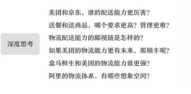 有人会说京东,有人会说美团,我们不去做标准答案,而是进一步思考:送餐和送商品,哪个要求更高?哪个管理更难?每个人的答案可能又不同了。