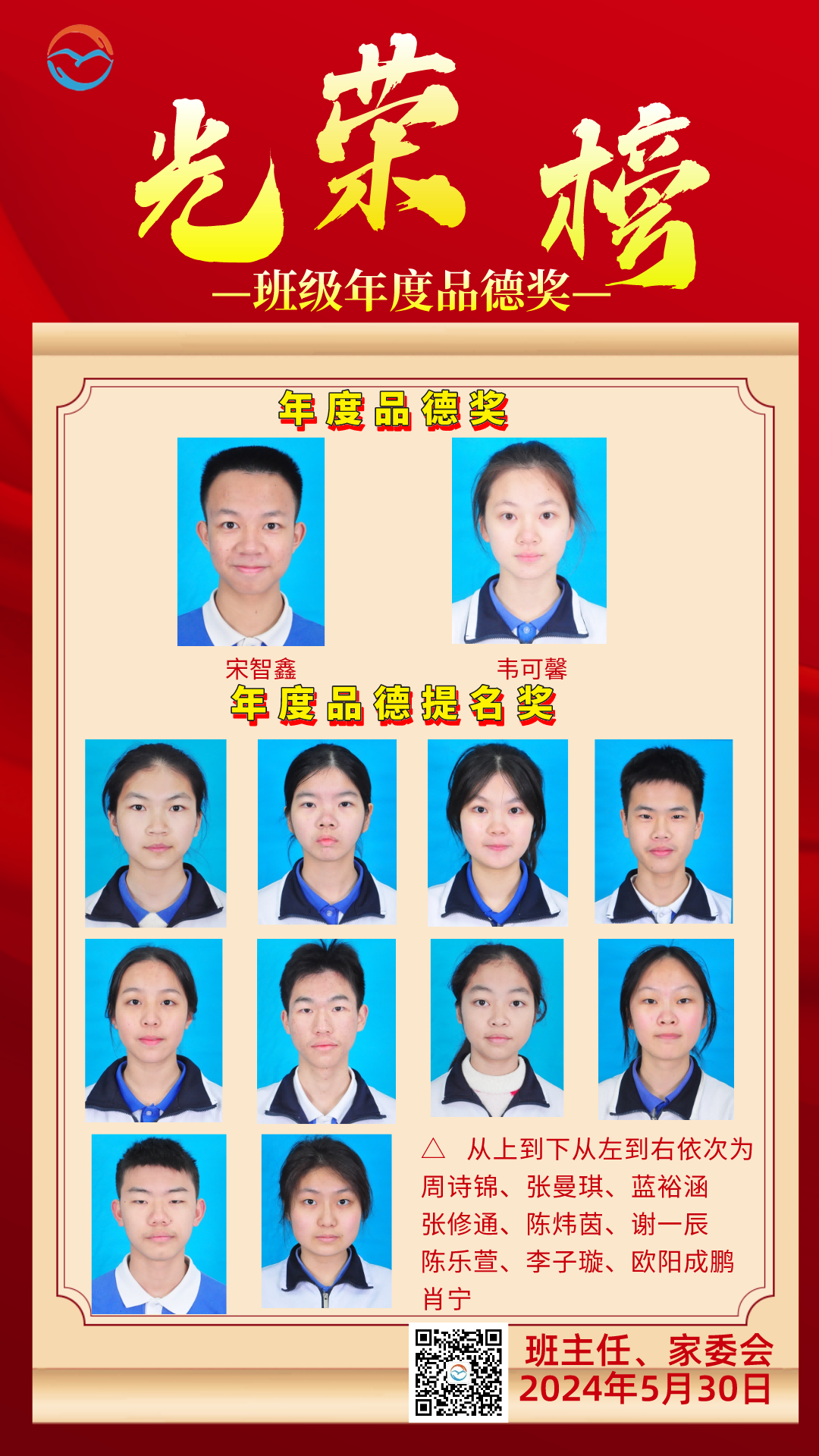 一年以来,班级涌现出了许多勤奋好学、品学兼优、明礼守信、自强自律的优秀学生,在班级科任老师、全体学生、全体家长的投票评选中,以下同学荣获班级年度品德奖,特提出公开表扬!